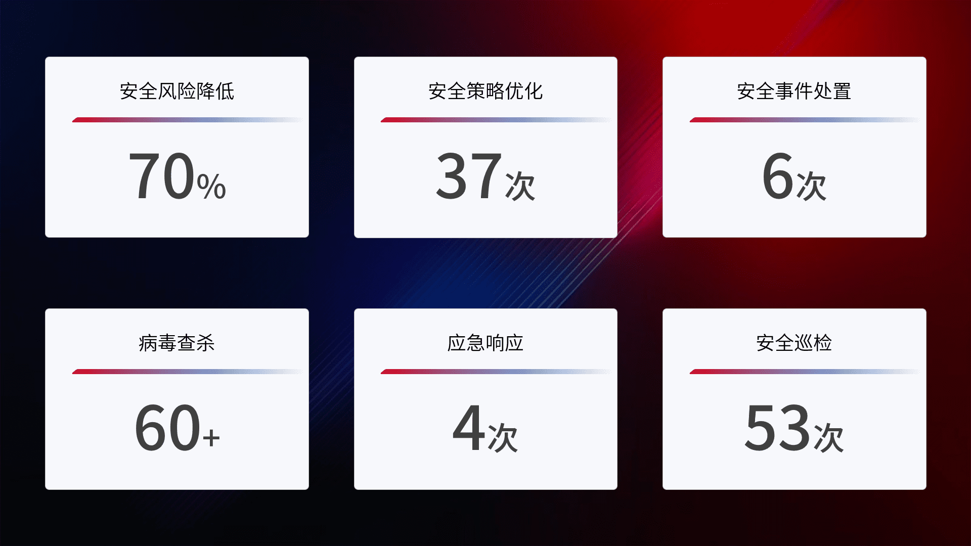 提供全面的安全事件报告体系,,包括处置报告、、、、周报、、季度和年度总结,,结合持续监控,,,帮助客户深入了解网络安全状况。。。
