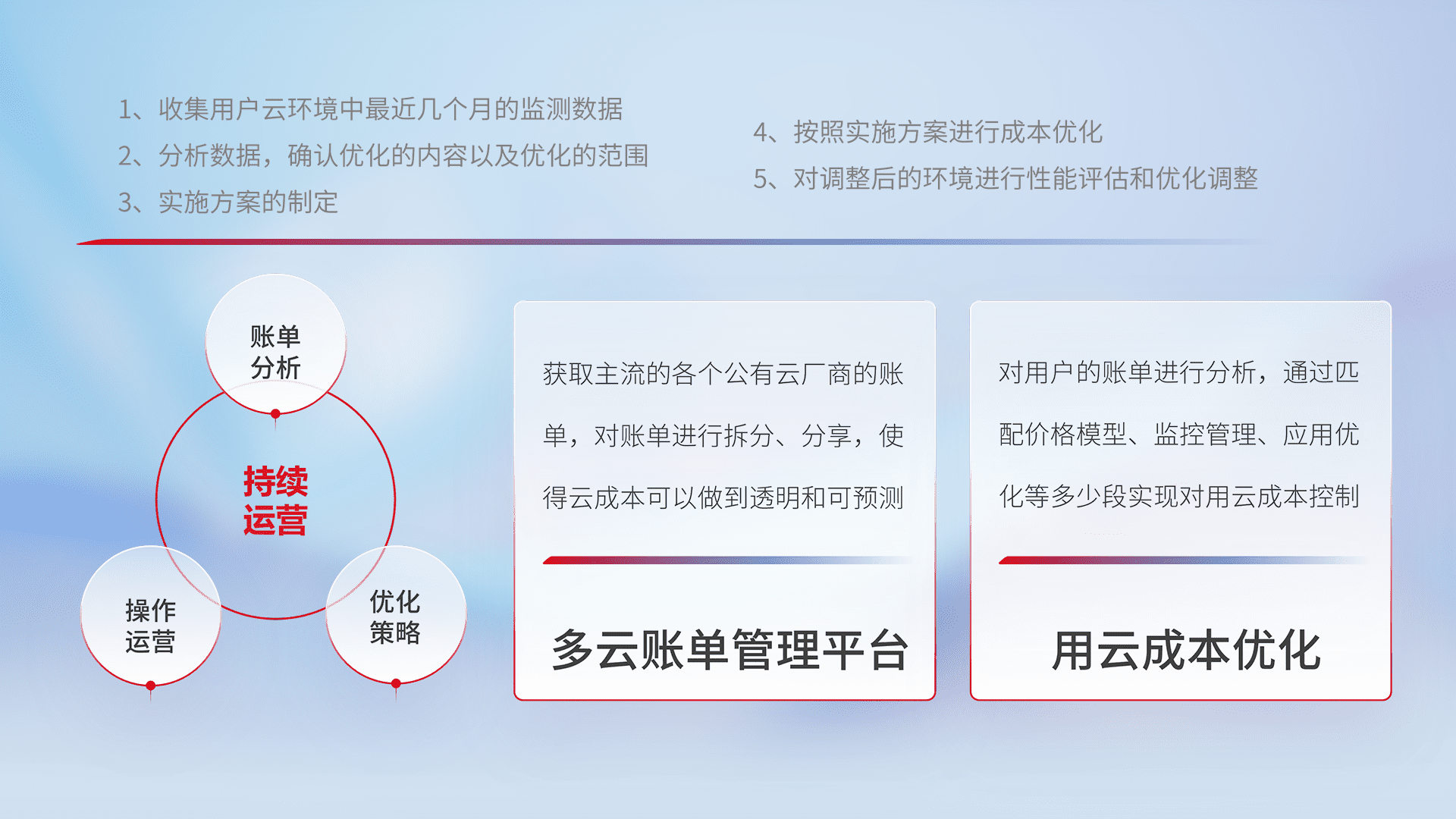 通过多云纳管,,以统一的资源数据模型把客户的云资源进行抽象和封装,,,进而实现对多云资源的统一操作,,保障云资源管理的可靠性、、、稳定性与可用性。。。量身定制化运维内容,,配置、、开发运维、、、补丁管理、、、、备份、、监控、、、、认证和访问管理、、、审计和日常巡检等,,,保障在用云过程中的可靠度,,稳定度以及高可用率。。