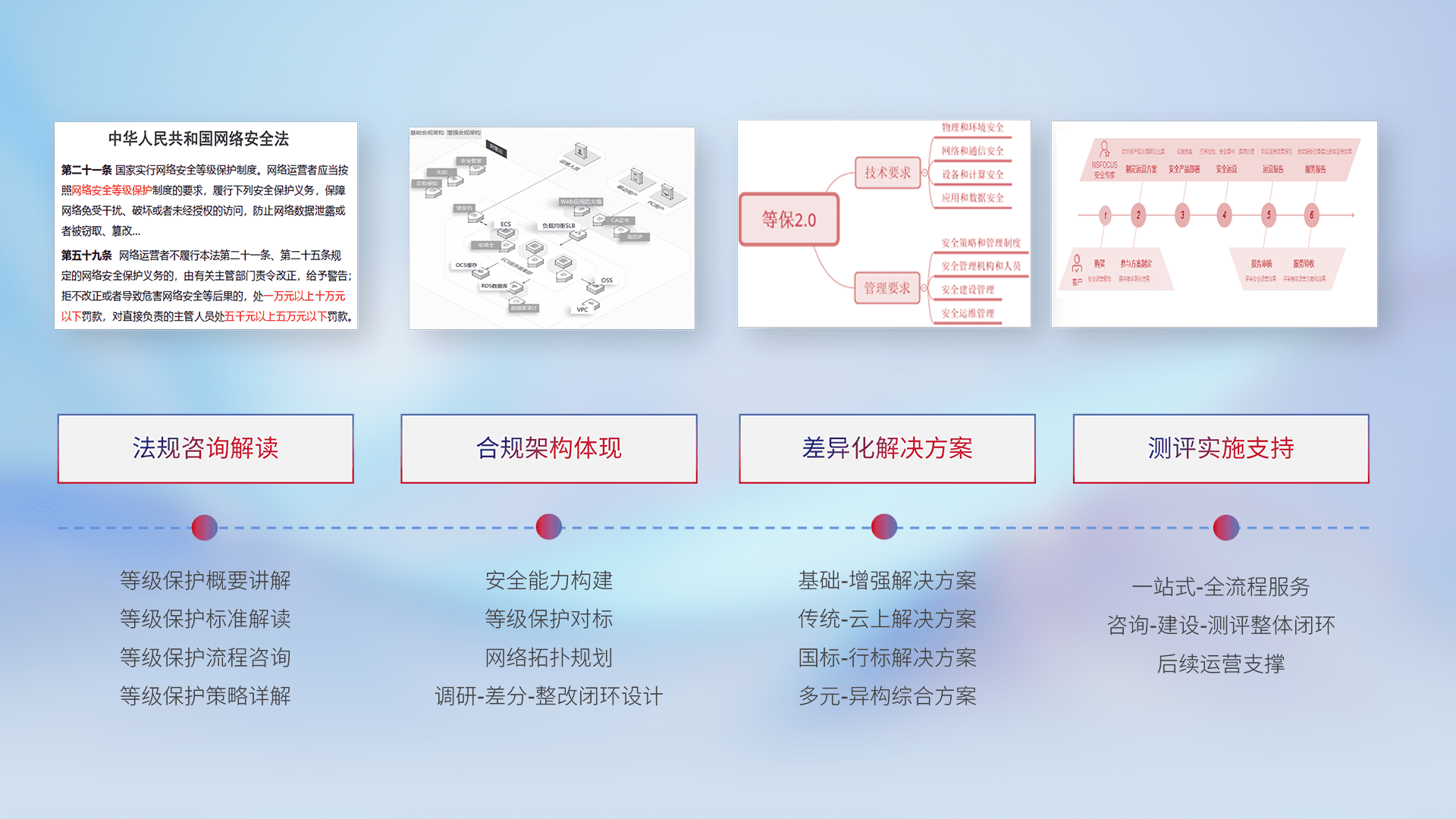 通过专业的法律咨询解读、、合规架构体现、、差异化解决方案、、、测试实施支持等服务,,为客户量身打造等保合规体系。。